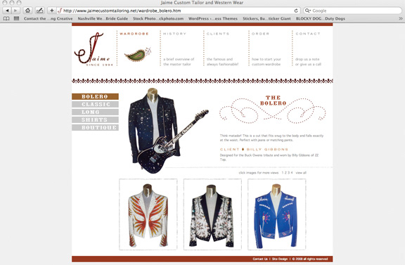 Jaime’s wardrobes are true pieces of art and can be seen on a variety of celebrities and in the high-end equestrian world. The design of the web site was to focus on the art of the wardrobe first and foremost.